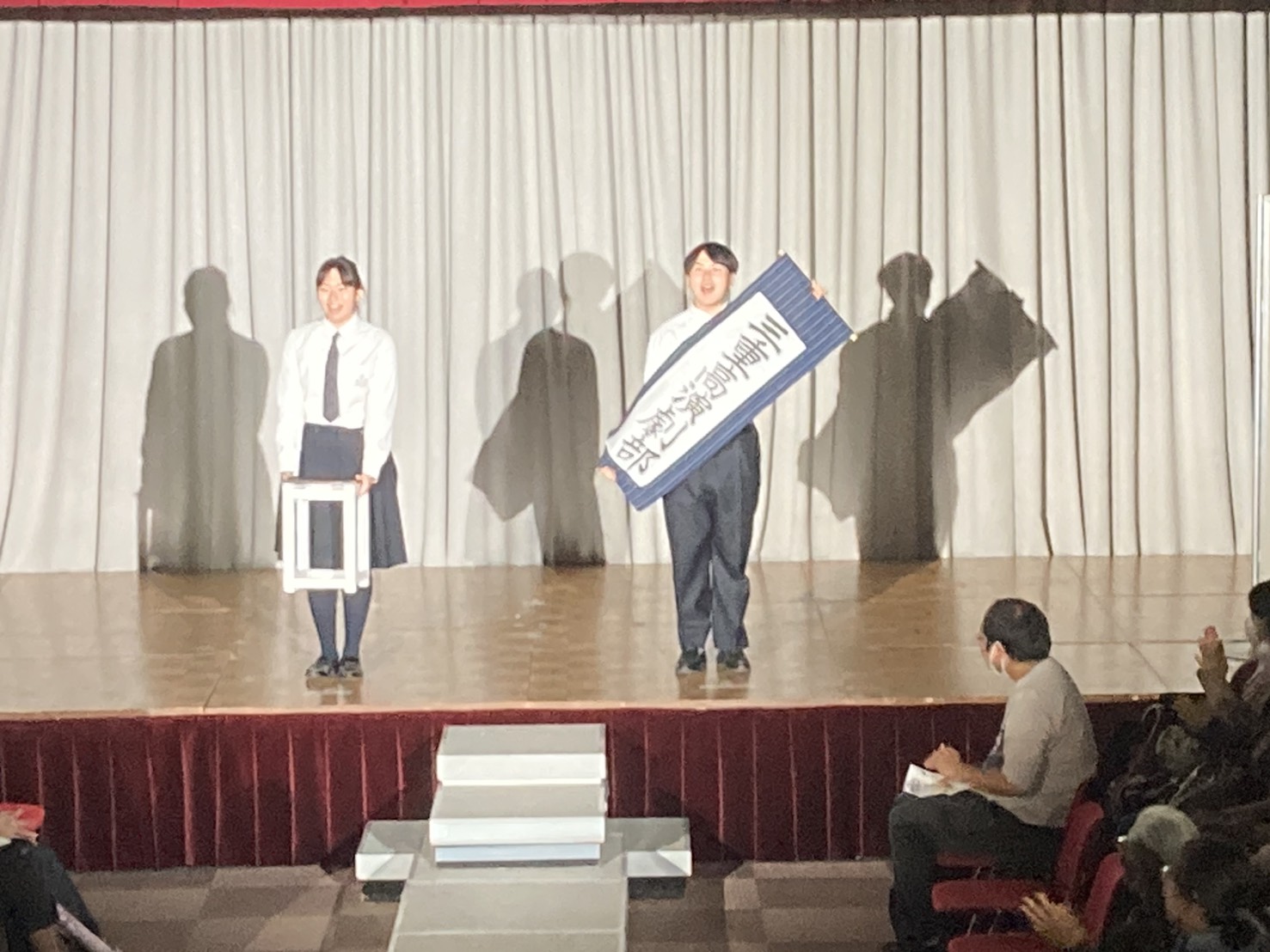 昨年度は照明ボランティアしかしなかったが、今年は10分前座の時間をいただき、創作劇(というか漫才?)「ゆらぎ」を上演した。